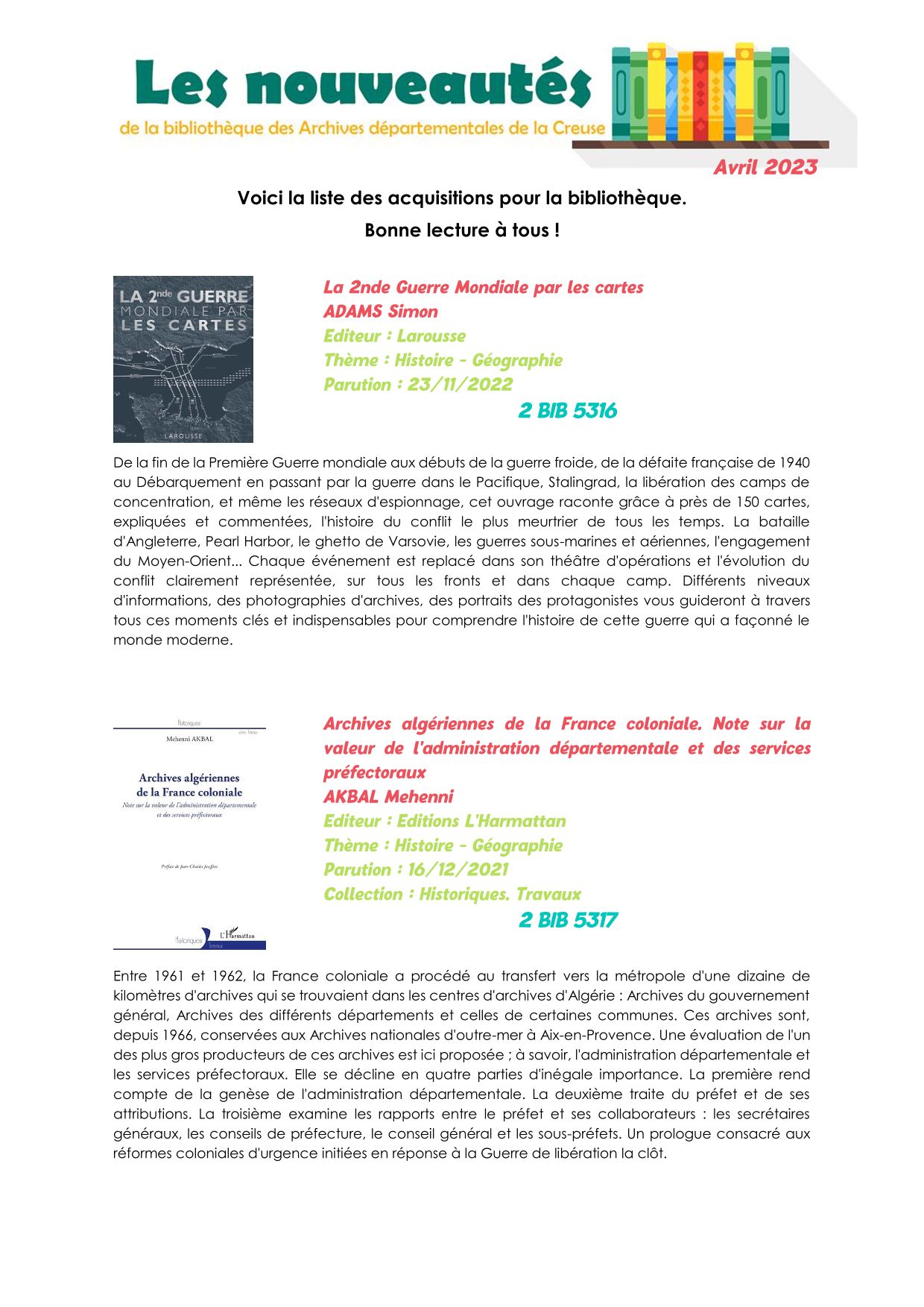 Voici les nouveautés de notre bibliothèque Les nouveautés de notre bibliothèque BIBLIONEWS2023_avril.pdf (808.3 Ko)