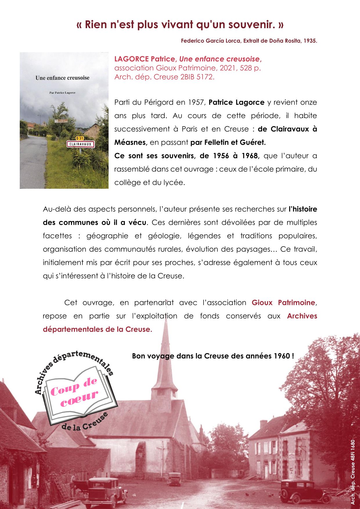 Coup de cœur de la bibliothèque ! Coup_de_coeur_BIB_Une_enfance_creusoise.pdf (487.9 Ko) Pour consulter les autres coups de coeur suivez ce lien : Bibliothèque