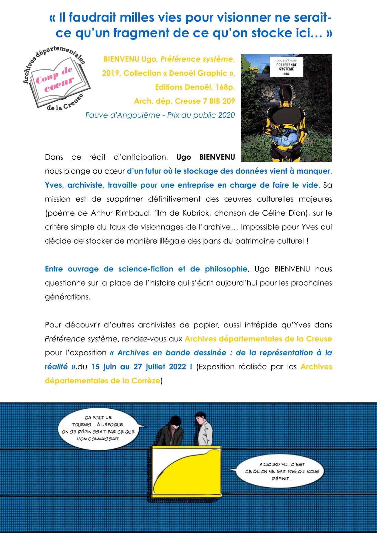 Coup de cœur de la bibliothèque ! Entre ouvrage de science-fiction et de philosophie, Ugo BIENVENU nous questionne sur la place de l’histoire qui s’écrit aujourd’hui pour les prochaines générations. BIENVENU Ugo.pdf (431.6 Ko)