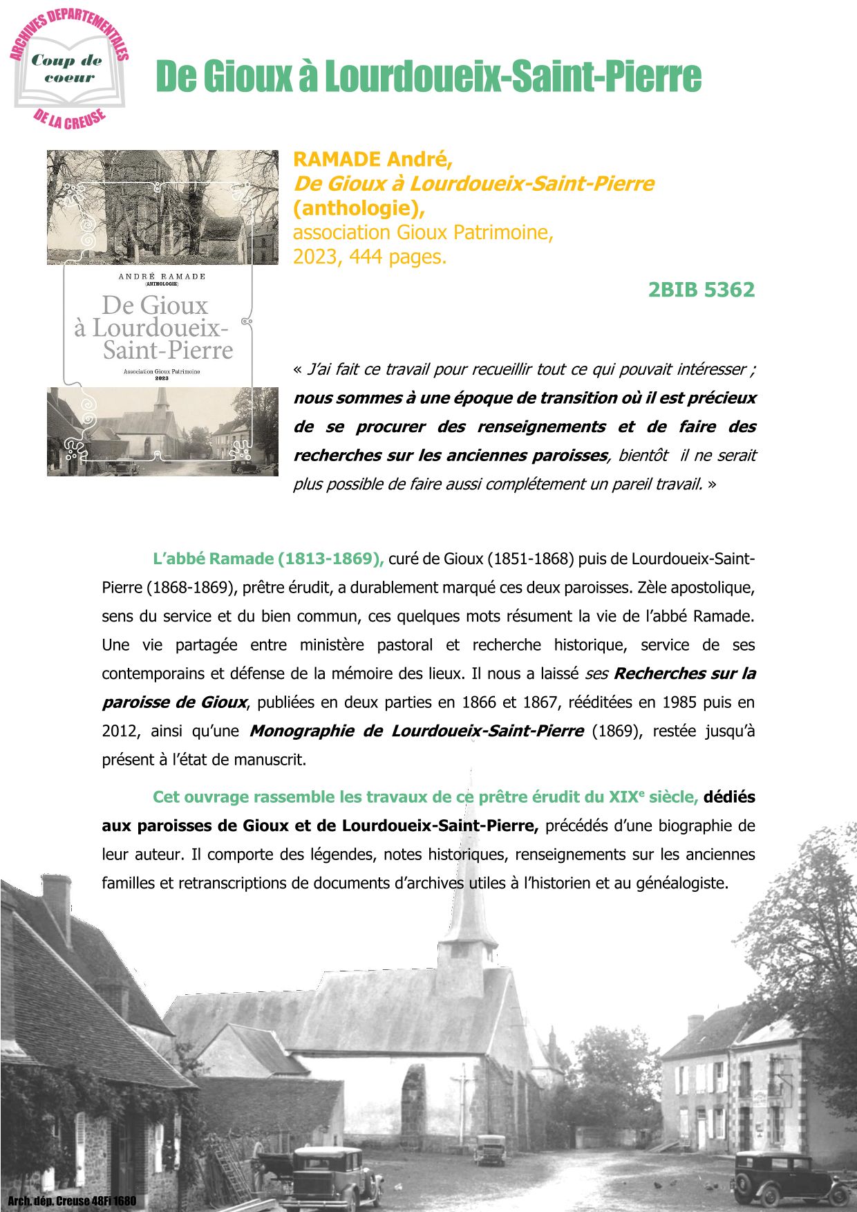 L'abbé Ramade (1813-1869), curé de Gioux (1851-1868) puis de Lourdoueix-Saint-Pierre (1868-1869), prêtre érudit, a durablement marqué ces deux paroisses. Il nous a laissé ses Recherches sur la paroisse de Gioux, publiées en deux parties en 1866 et 1867, rééditées en 1985 puis en 2012, ainsi qu’une Monographie de Lourdoueix-Saint-Pierre (1869), restée jusqu’à présent à l’état de manuscrit.