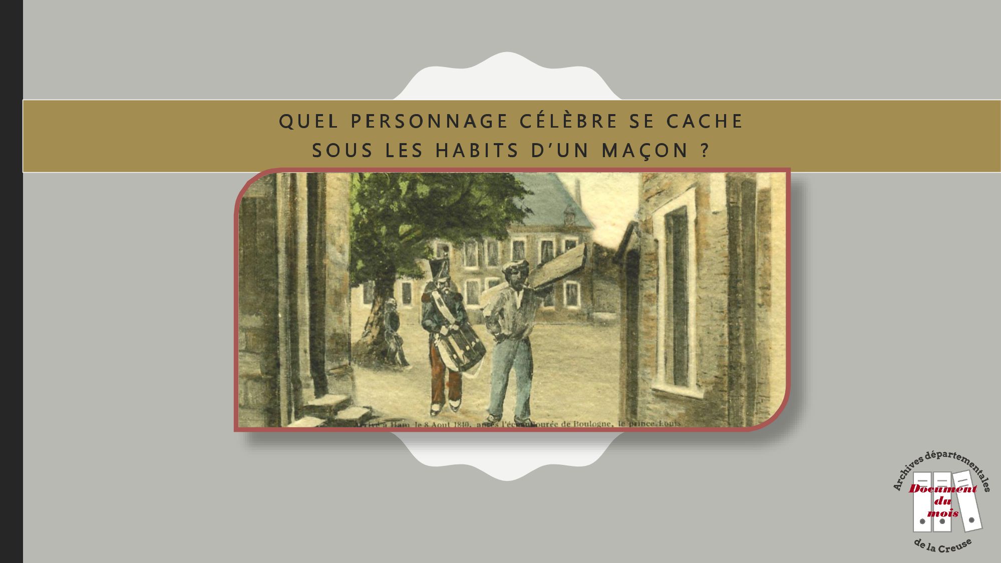 Document du mois de mai : Découvrez le récit d'une rocambolesque évasion ...ou quand un personnage célèbre se déguise en maçon pour sortir de prison... Consulter le document (1.9 Mo)