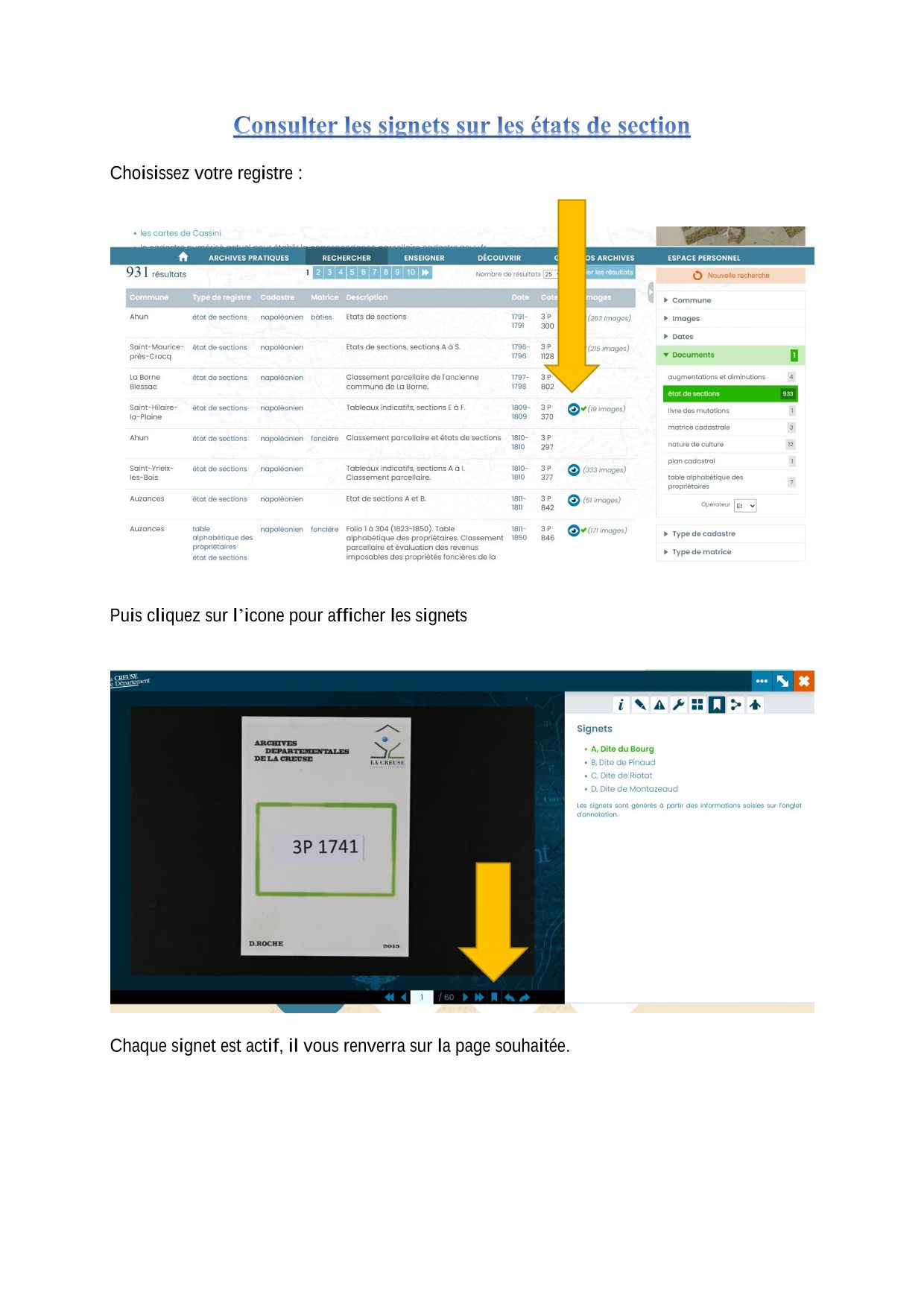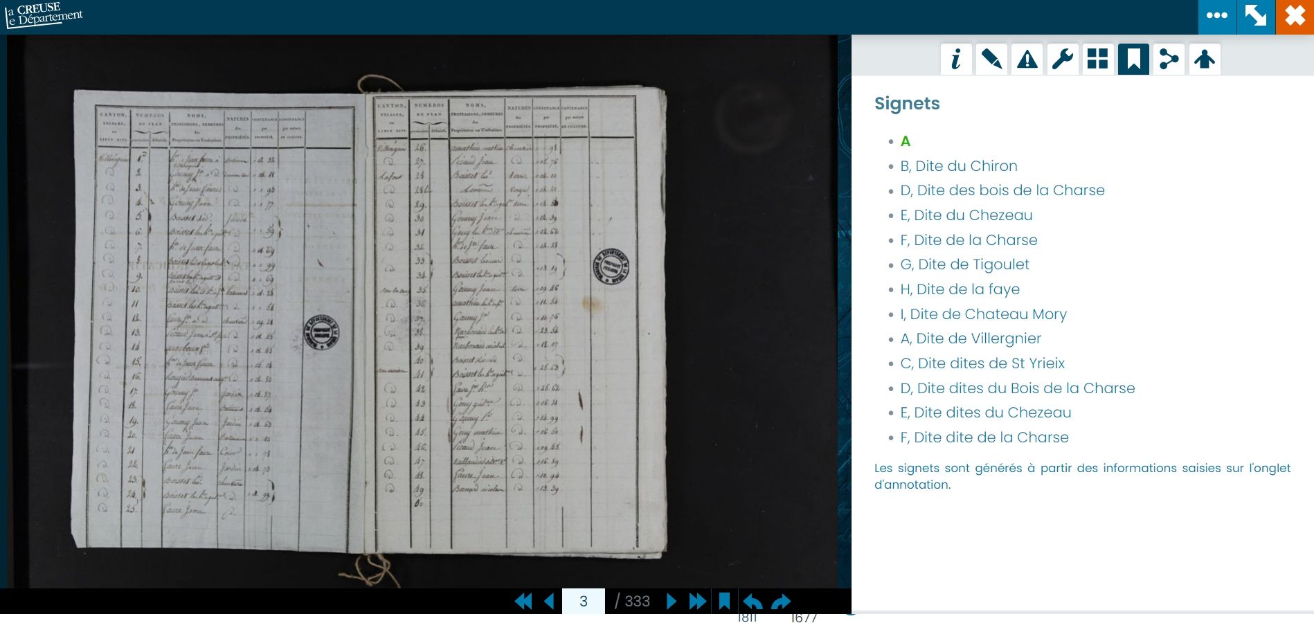 Dès à présent vous trouverez dans les vues numérisées des états de section (Cadastre) des signets. Ces marques-pages vous permettront d'évoluer facilement à l'intérieur du registre.