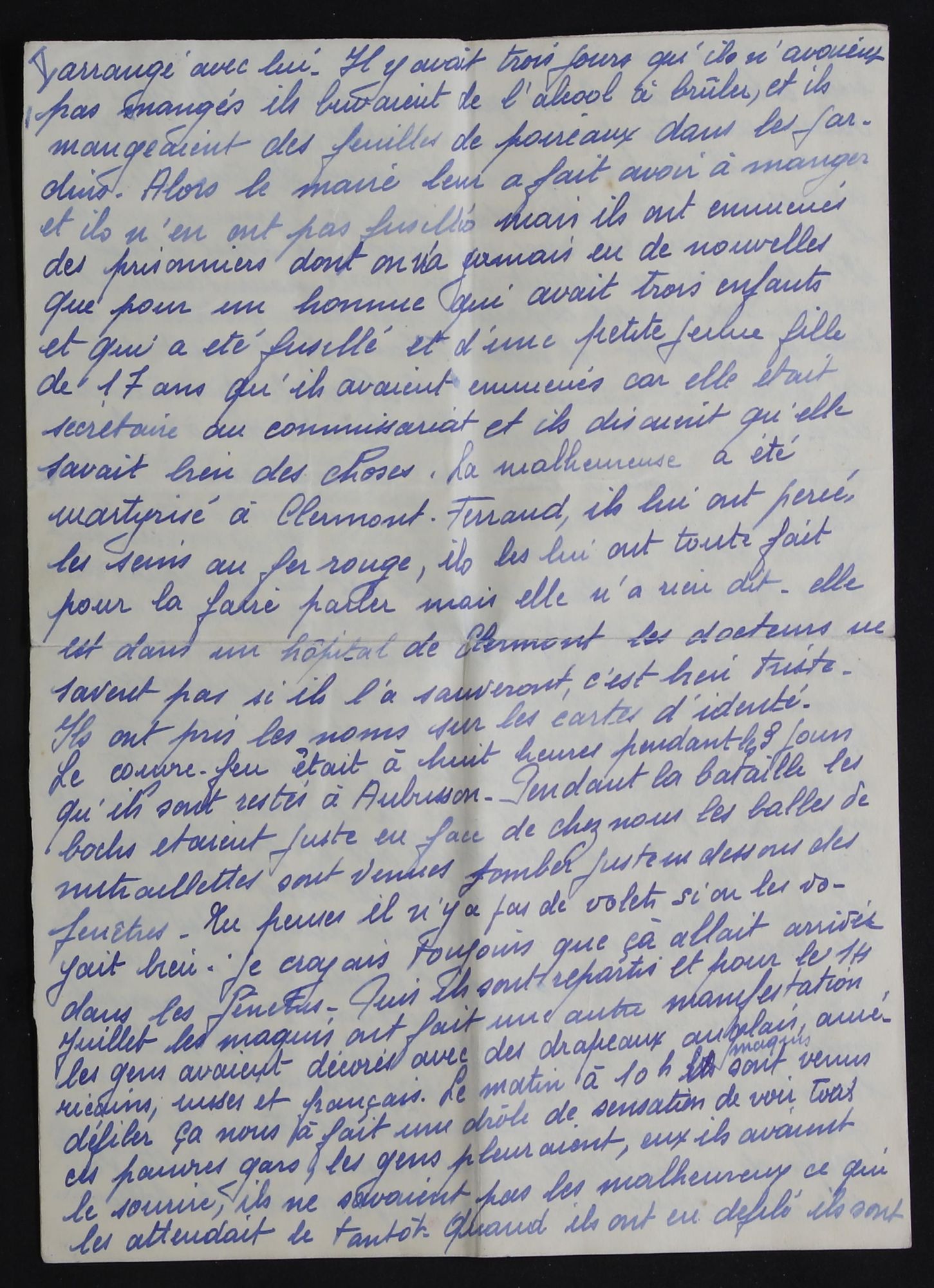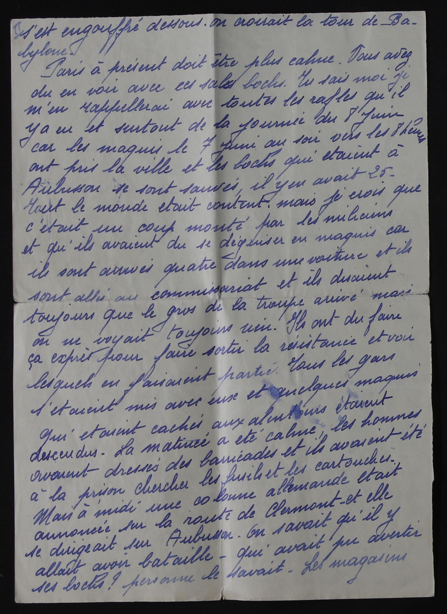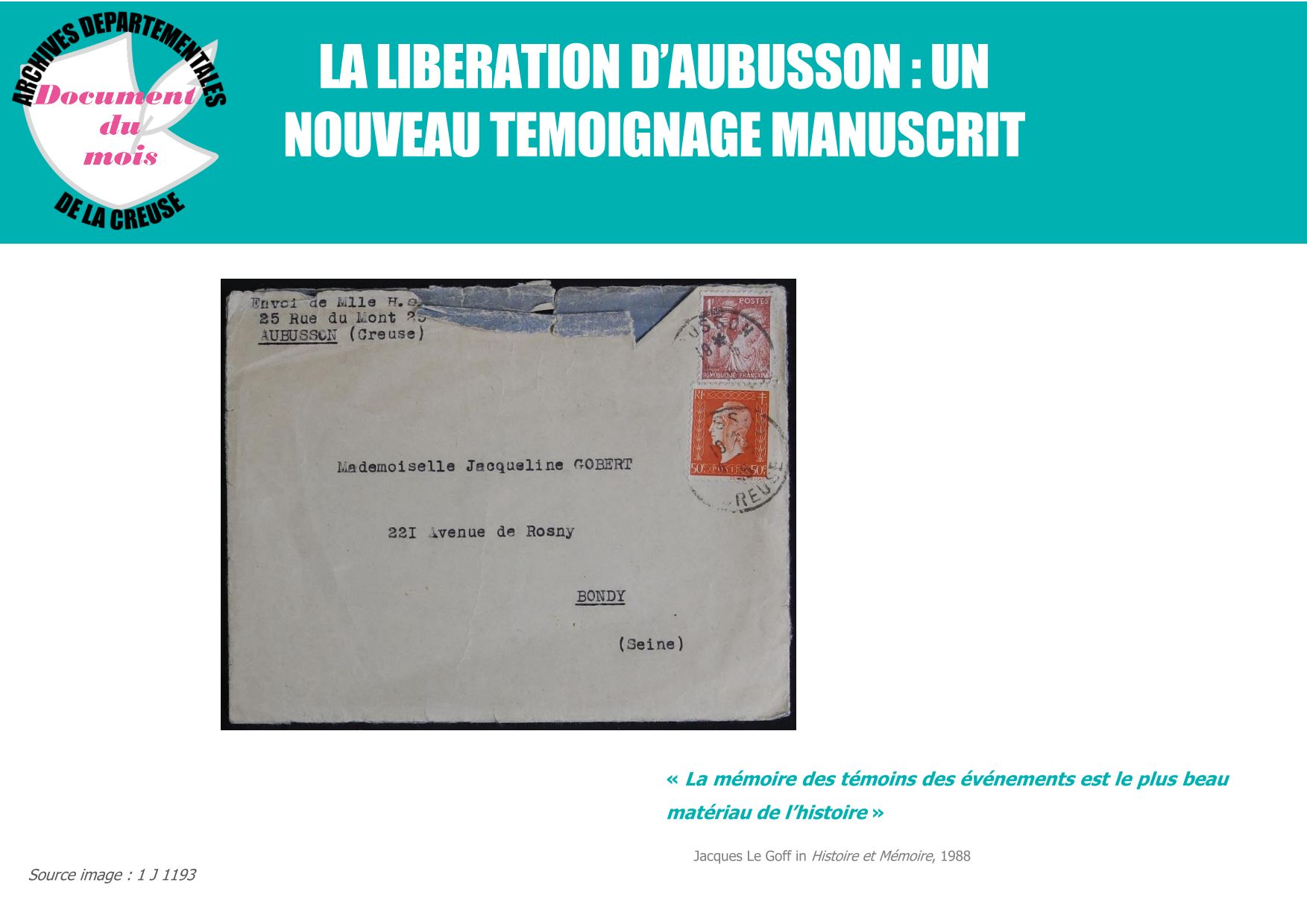 Document du mois de Juin : "La libération d'Aubusson, un nouveau témoignage manuscrit." Découvrir le document (1.1 Mo) Consultez l'intégralité de la corresponce cotée 1J 1193 :