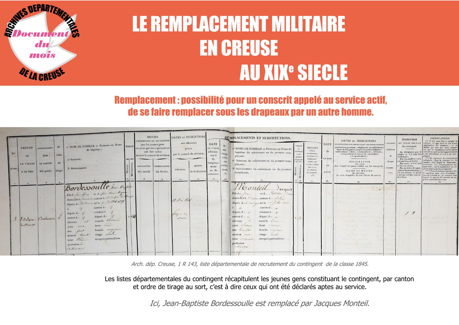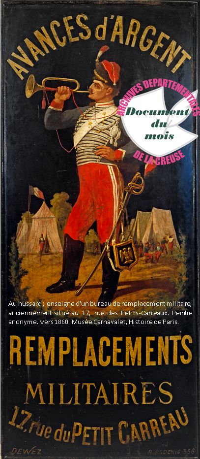 Document du mois de septembre: Le remplacement militaire en Creuse au XIXe siècle Le remplacement, un aspect souvent méconnu du vécu des obligations militaires au XIXe siècle. Découvrez le document (1.6 Mo)