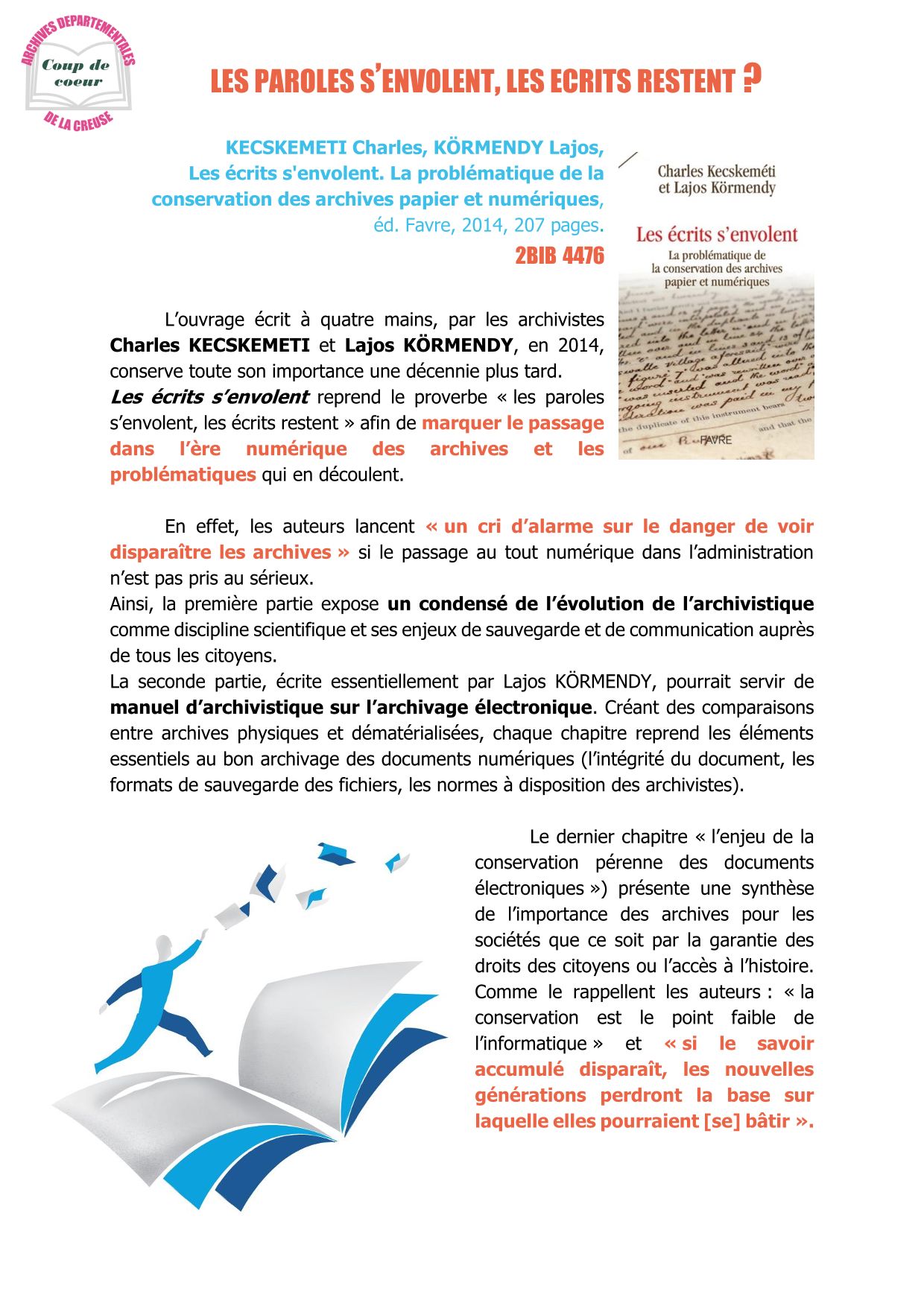 Charles KECSKEMETI et Lajos KÖRMENDY, Les écrits s'envolent. La problématique de la conservation des archives papiers et numériques, édition Favre, 2014.