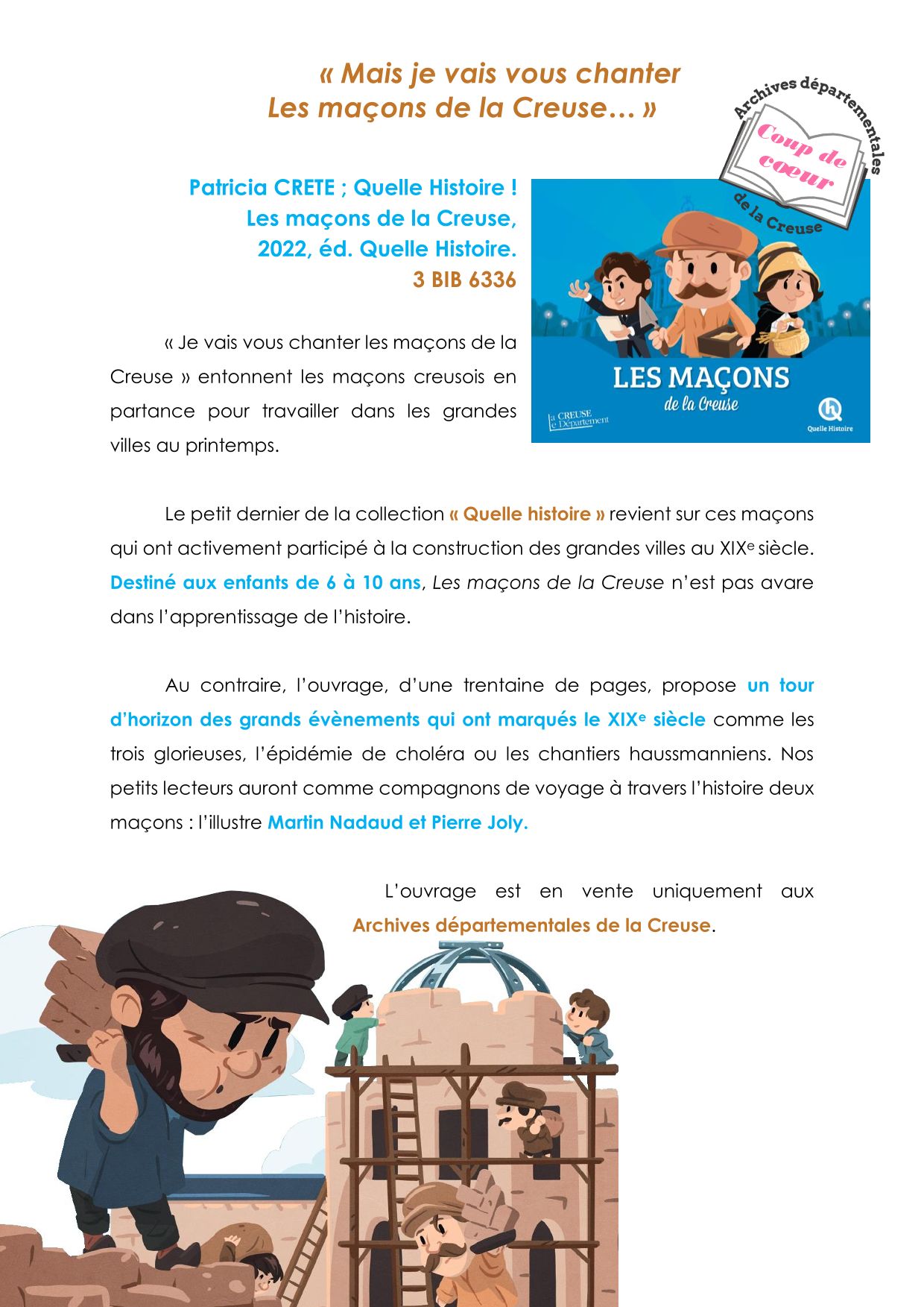 Nouveau coup de cœur de la bibliothèque : Quelle histoire! Les maçons de la Creuse Consultez le document (252.7 Ko)