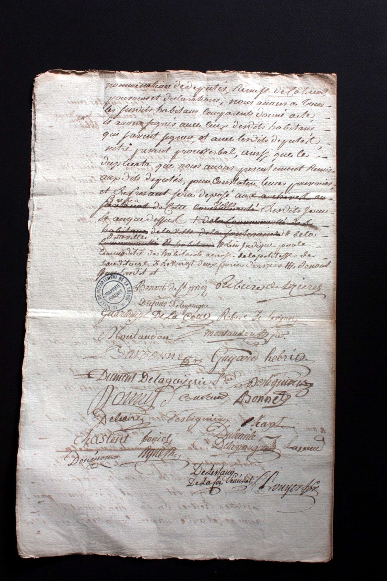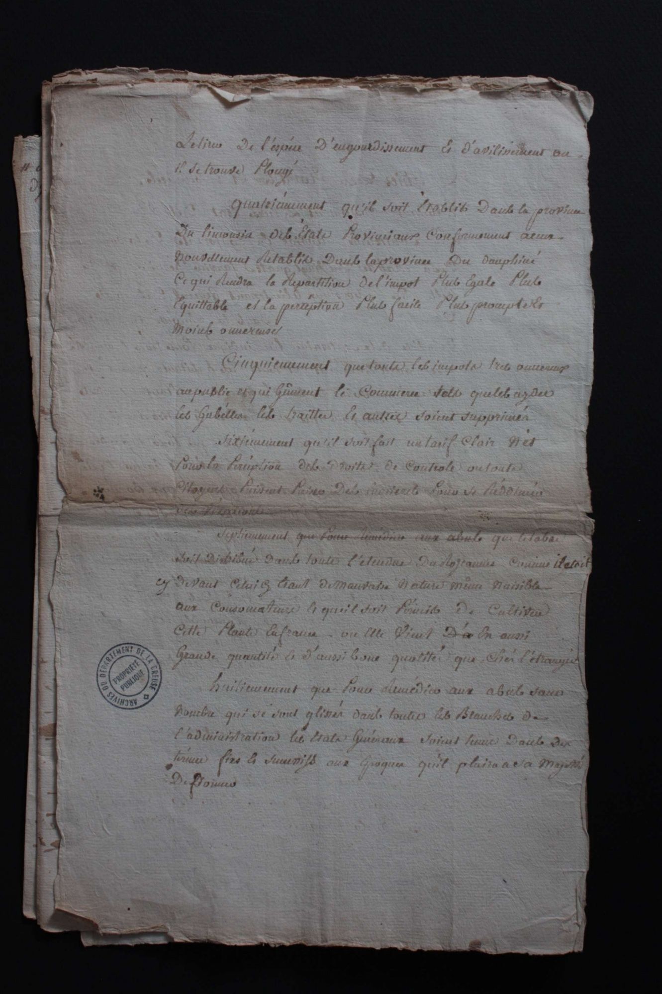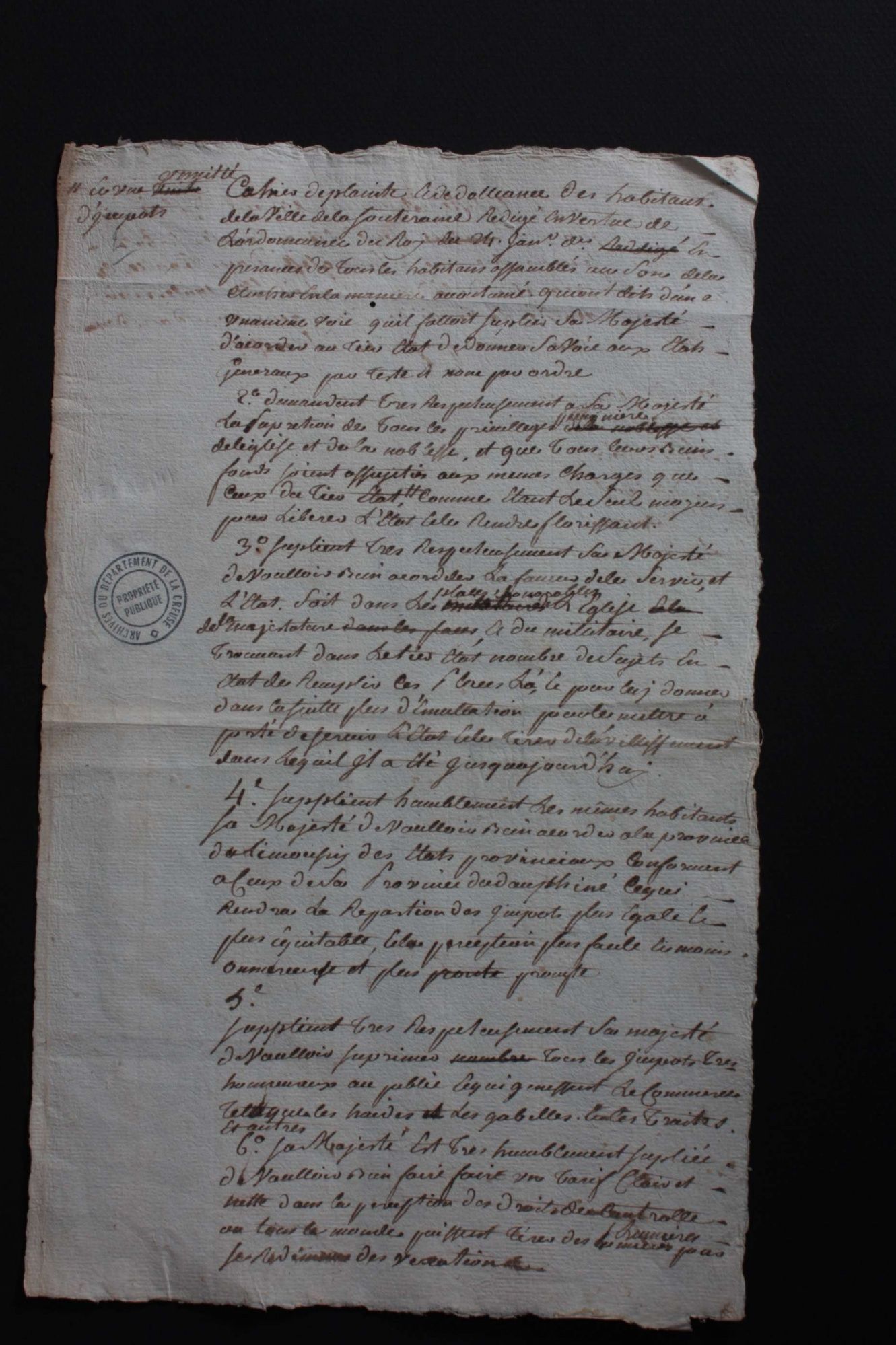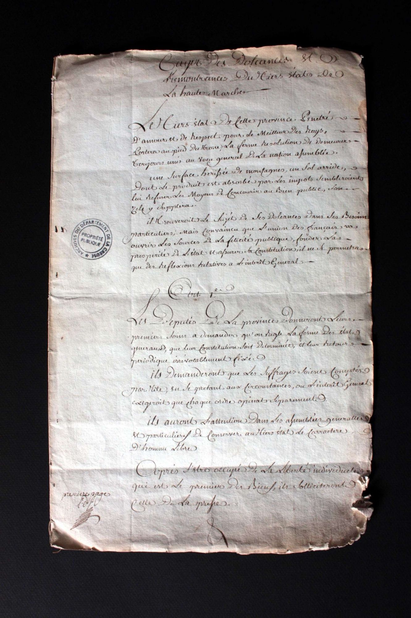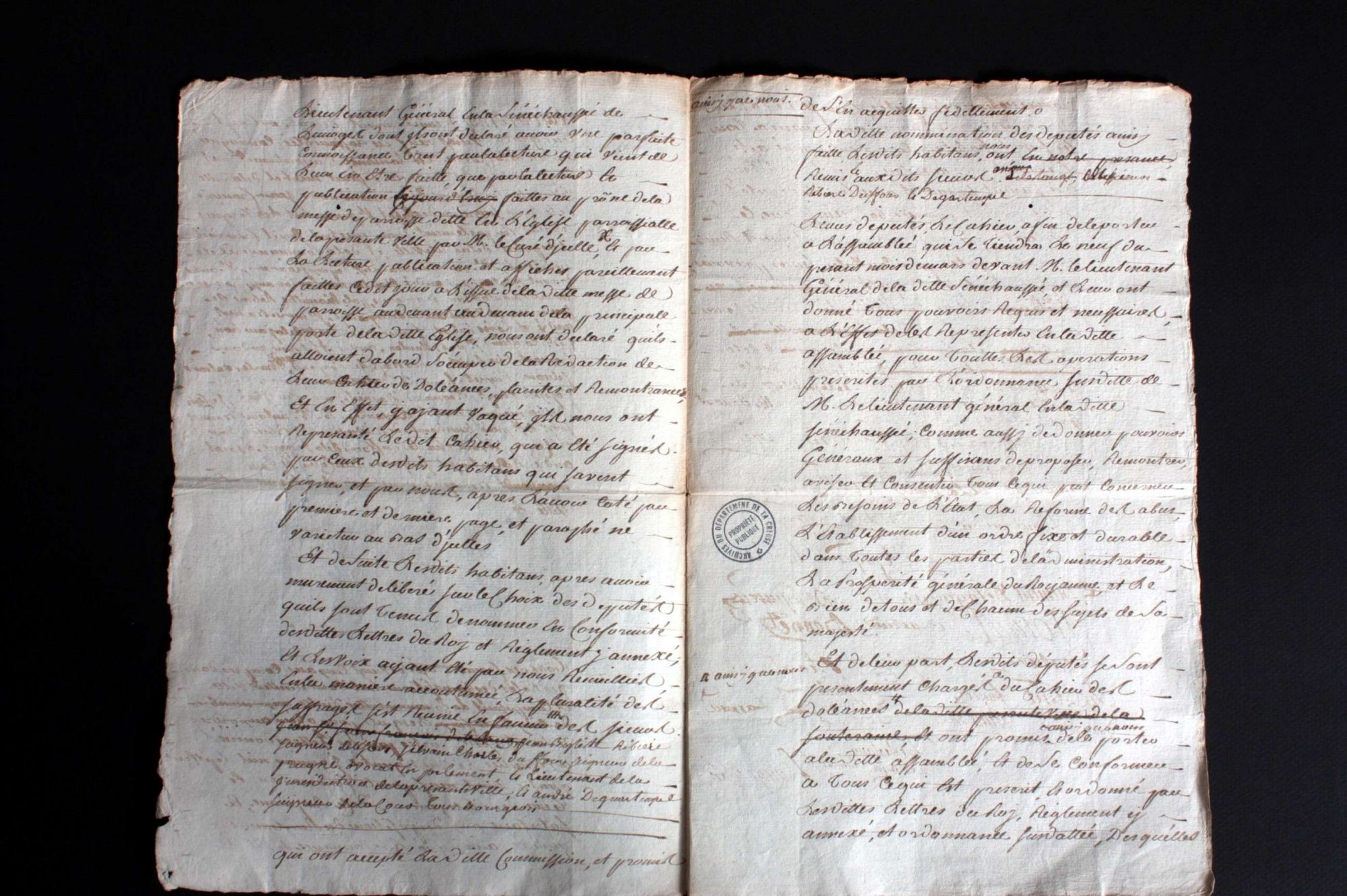 Pour l’actuel département de la Creuse, ne sont conservés que très peu de cahiers de doléances. Hormis ceux de la noblesse et du clergé, conservés aux Archives nationales, et ceux conservés aux Archives de la Creuse, sont connus par des éditions ou des citations les cahiers de doléances des paroisses d’Aubusson, de Boussac, de Felletin, de Guéret, du Moutier d’Ahun, de Saint-Martin-Château et de Saint-Vaury.