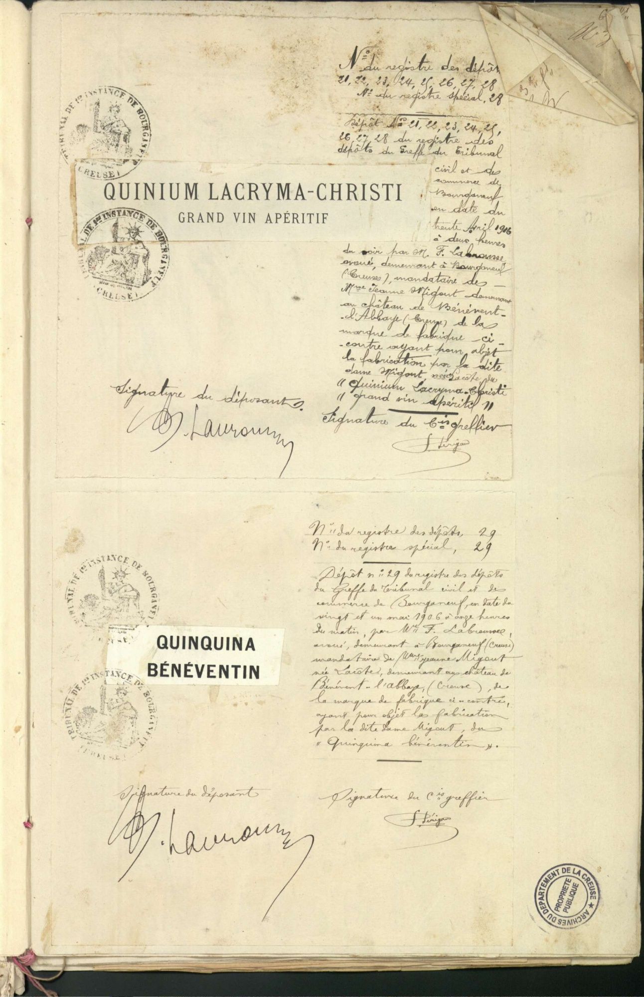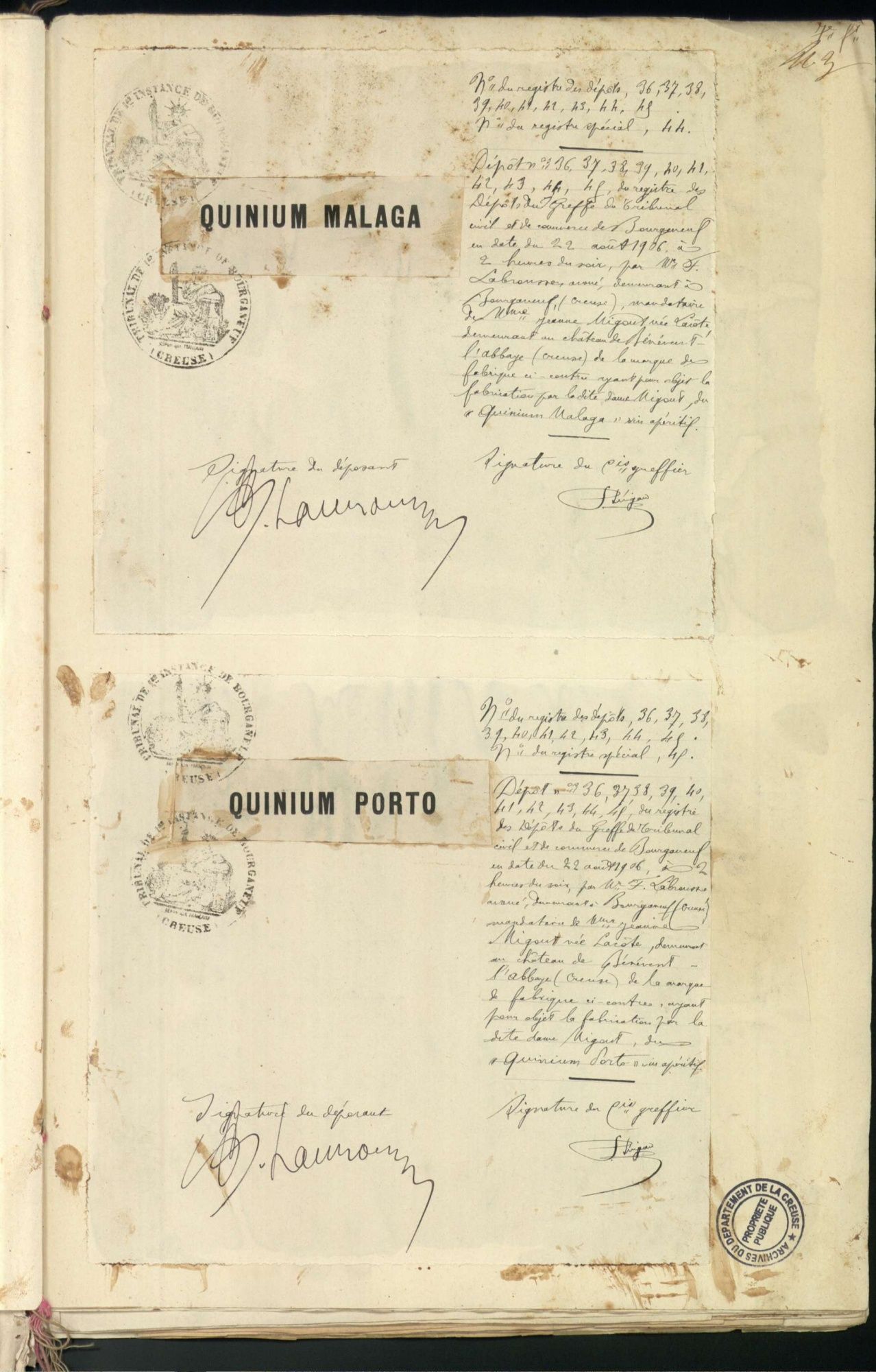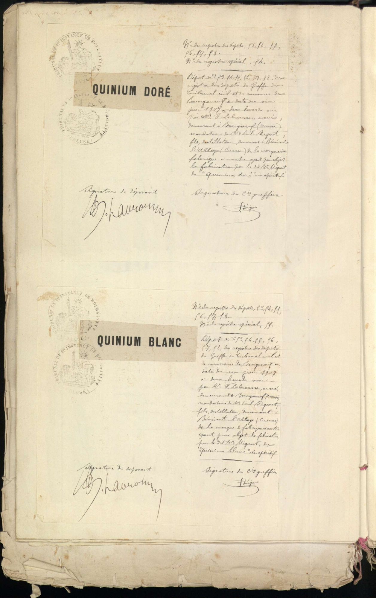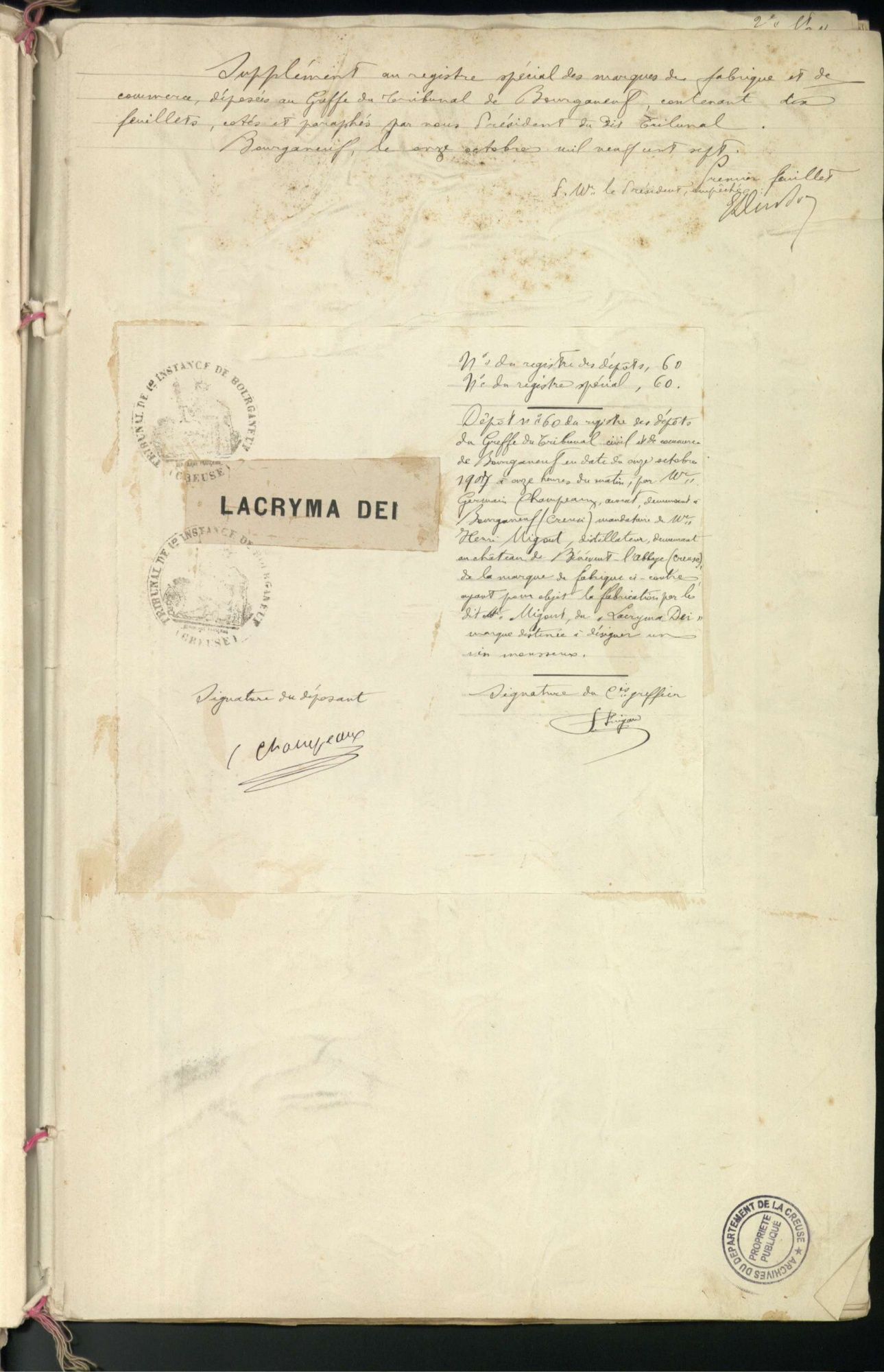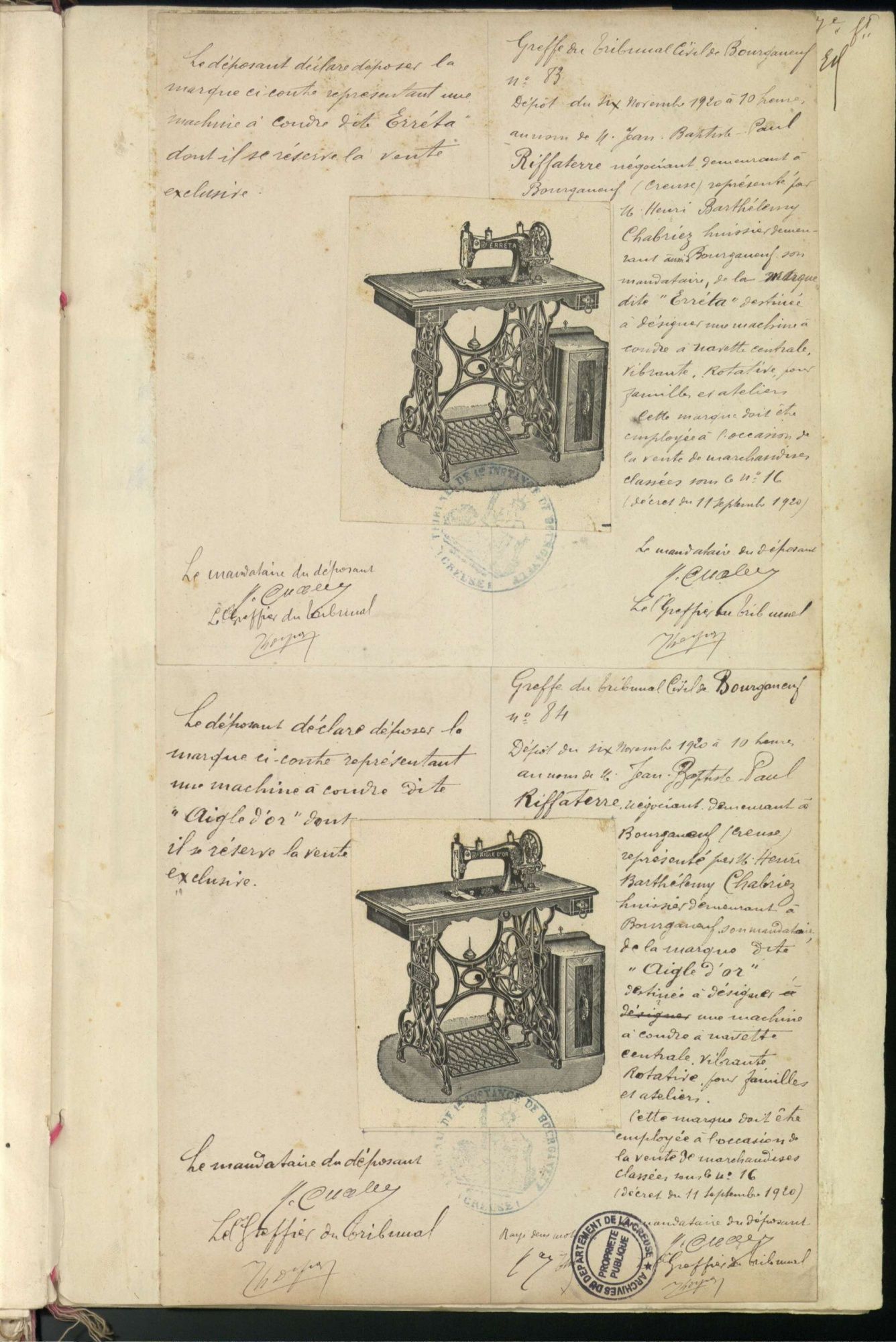 Marques de fabrique déposées au Tribunal de Commerce de la Creuse.