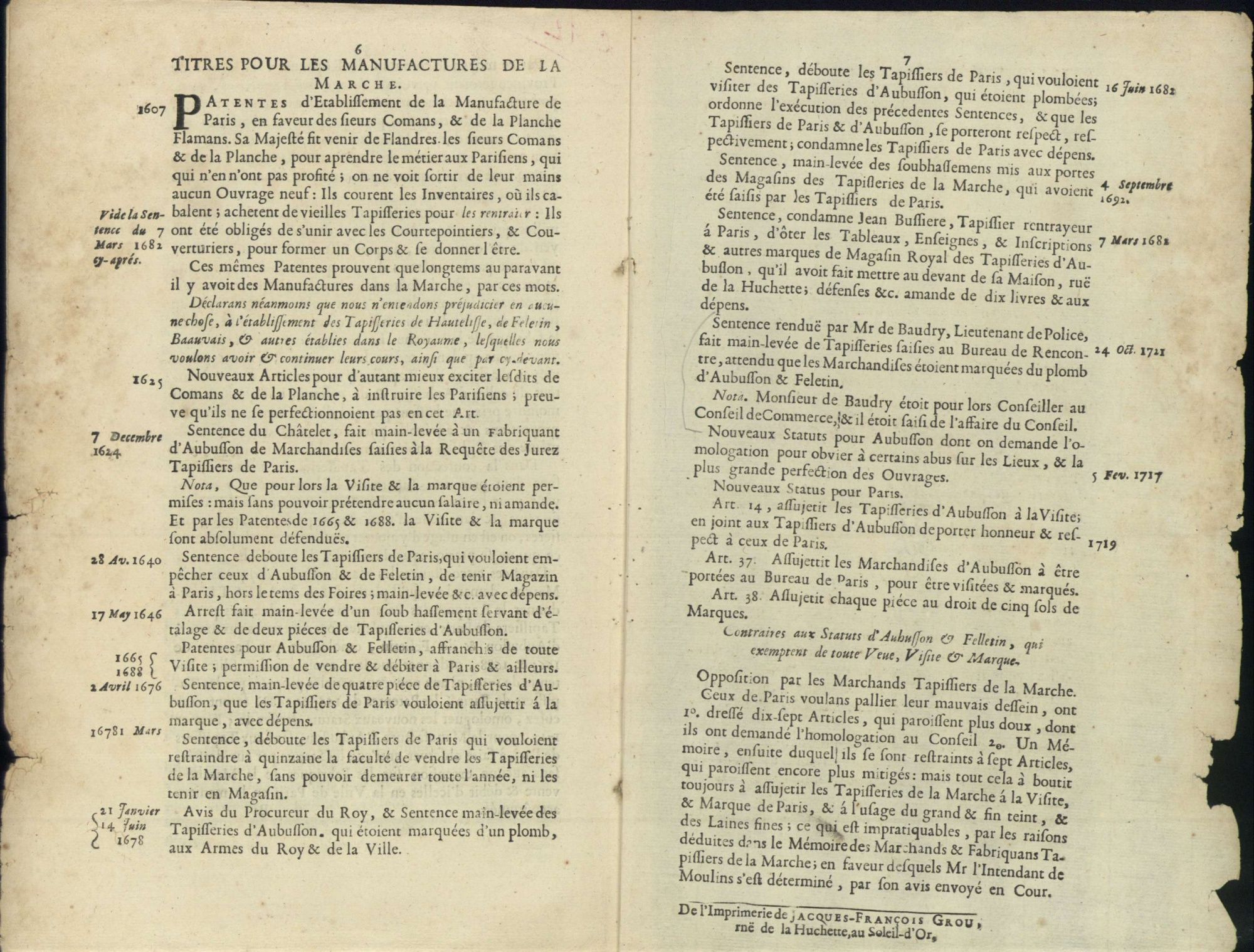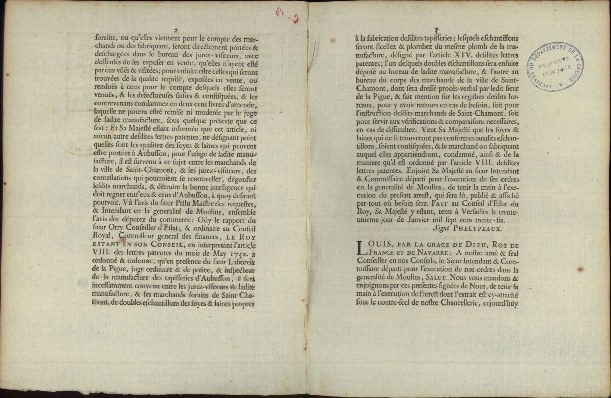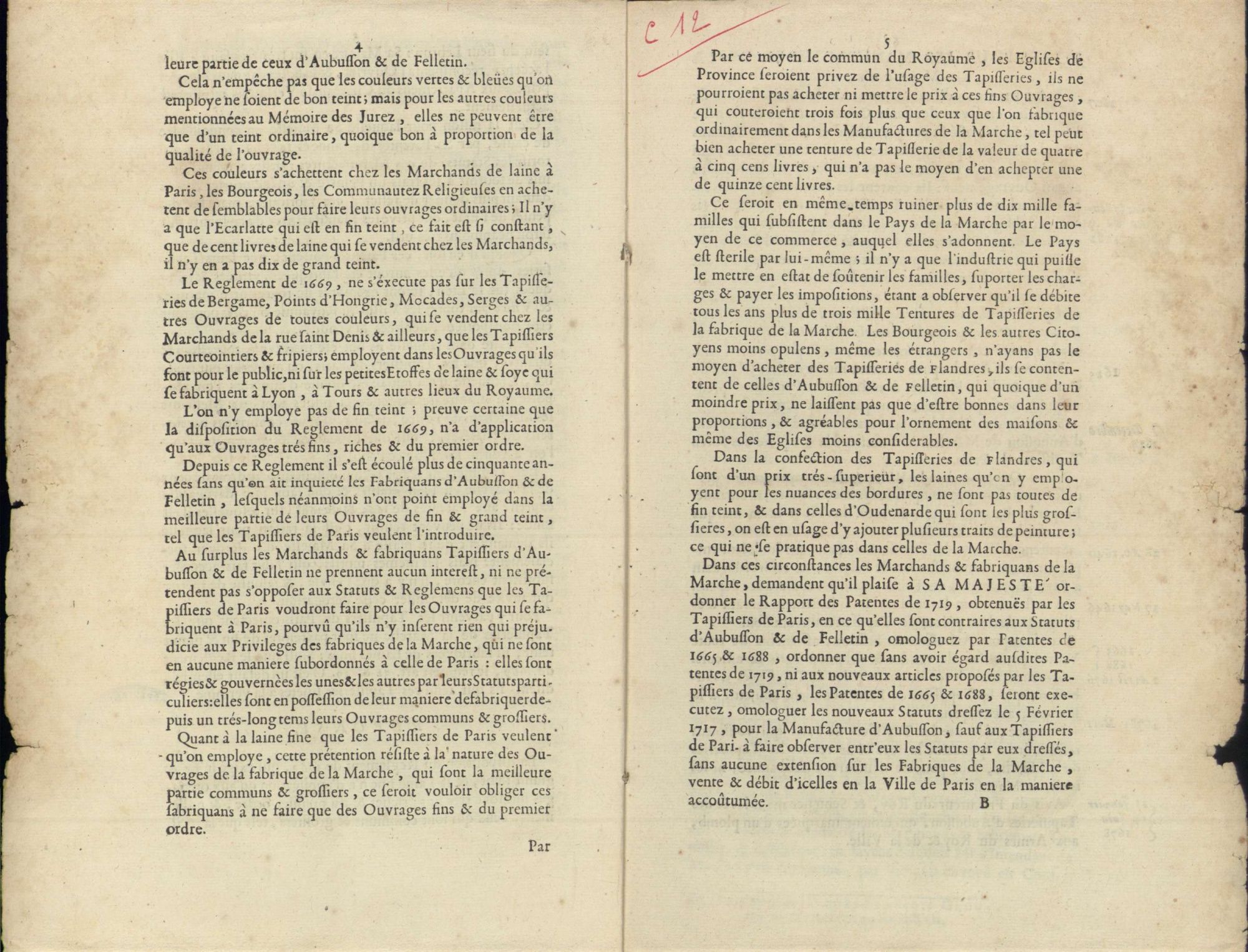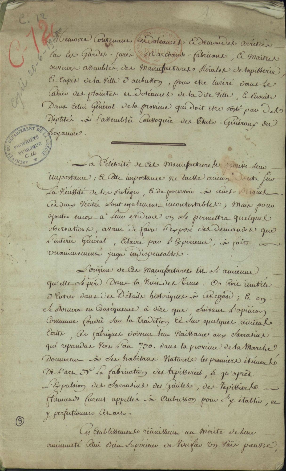 Ces documents (en majorité) du XVIIIème siècle nous plongent dans une époque, où ce secteur d’activité économique était très dynamique. Ces textes originaux montrent combien ce secteur d’artisanat d’art était réglementé pour garantir une haute qualité de production et protéger un savoir-faire unique. Ces manufactures d’Aubusson et de Felletin, protégées par le titre de manufactures royales, étaient un centre économique, social et aussi artistique, qui rayonnait bien au-delà des frontières de la Creuse.
