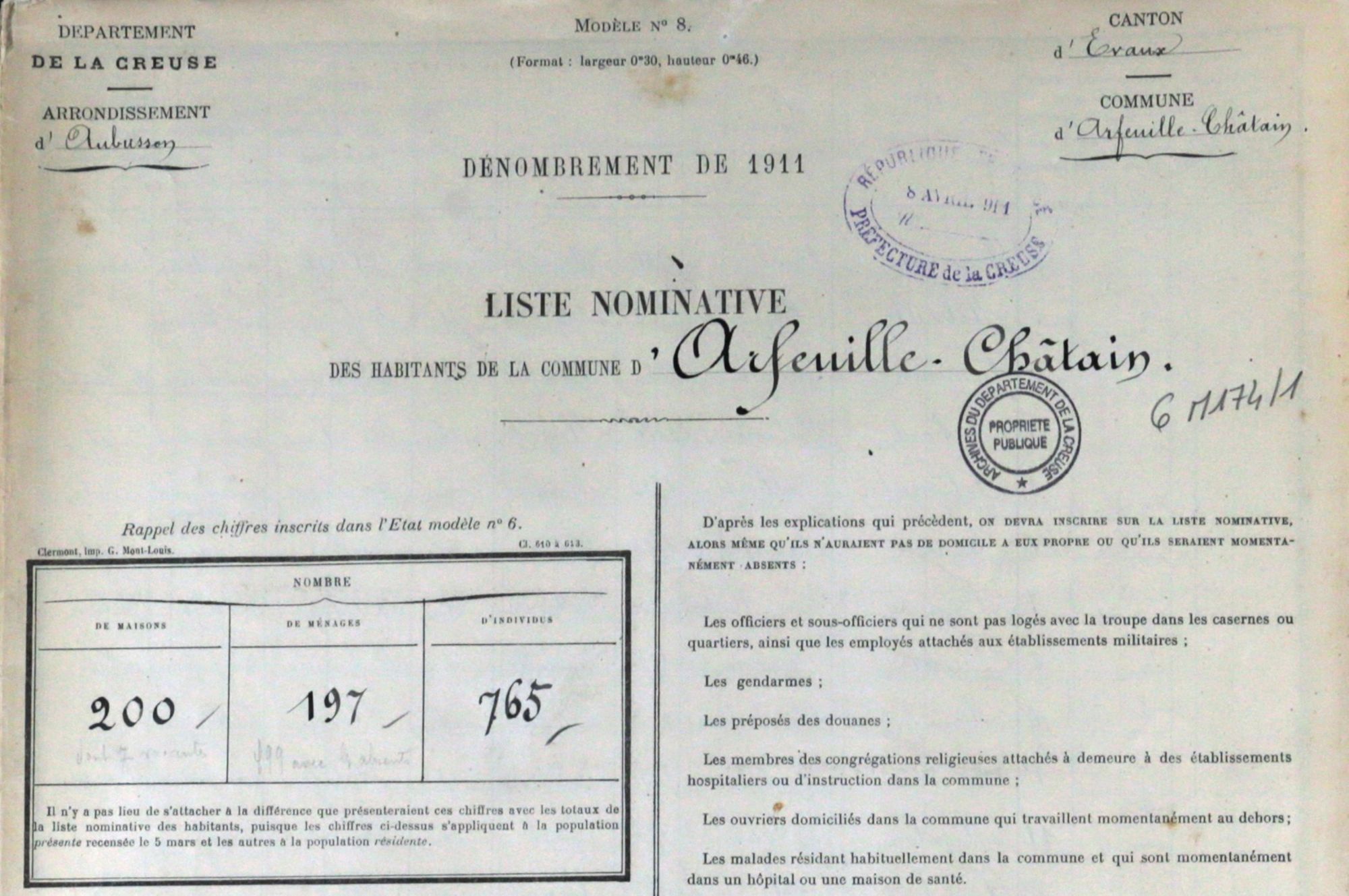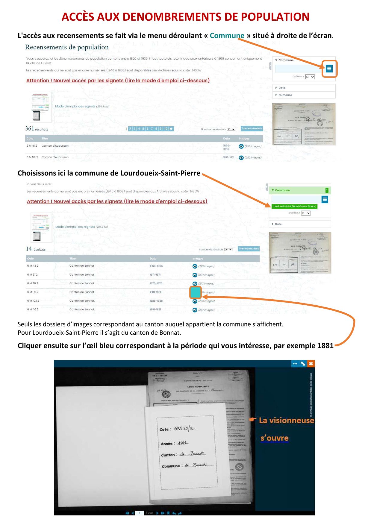 Vous trouverez ici les dénombrements de population compris entre 1820 et 1936. Il faut toutefois retenir que ceux antérieurs à 1866 concernent uniquement la ville de Guéret.