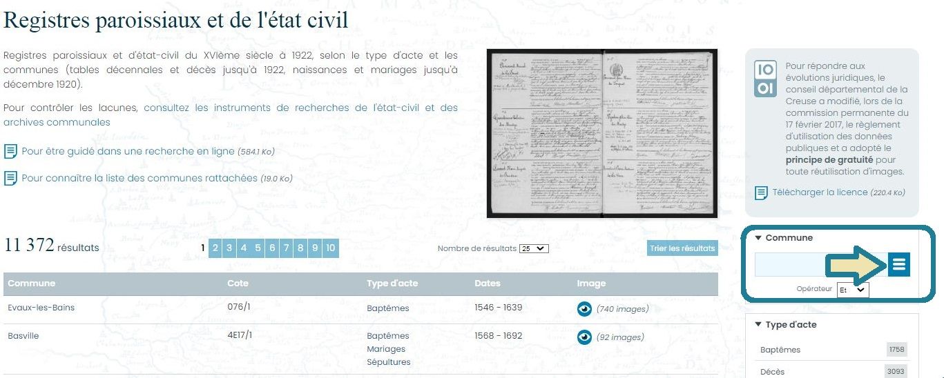 Une fois la vignette ouverte et le formulaire de recherche à l’écran, sélectionner la commune dans la liste proposée en cliquant sur l'icone située à la fin du champs "Commune".