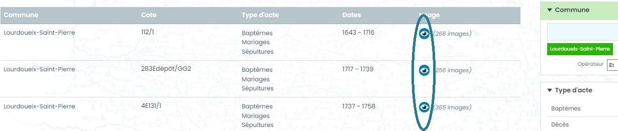 Vous aurez alors accès aux actes, classés par période chronologique, en cliquant sur l’icône « oeil » bleu situé en face du dossier qui vous intéresse.